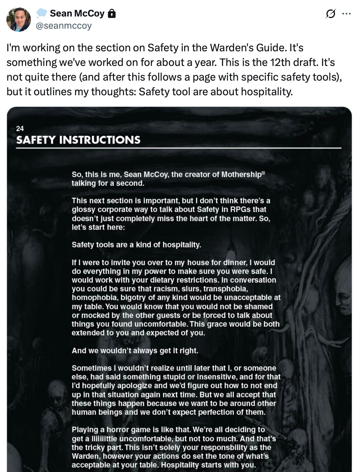 I wrote up a thread recently about safety tools in RPGs/mothership, but I wanted to archive it here for future reference and expand on it a little bit. Let's get into it: